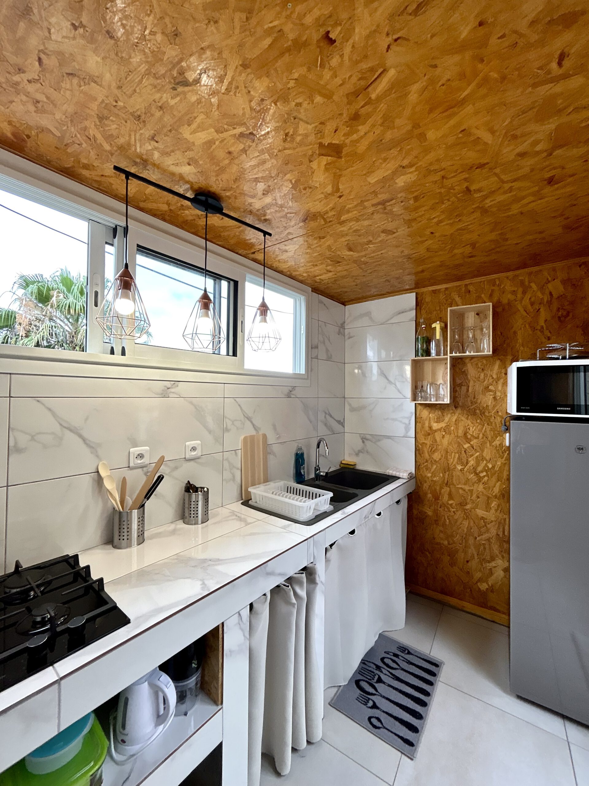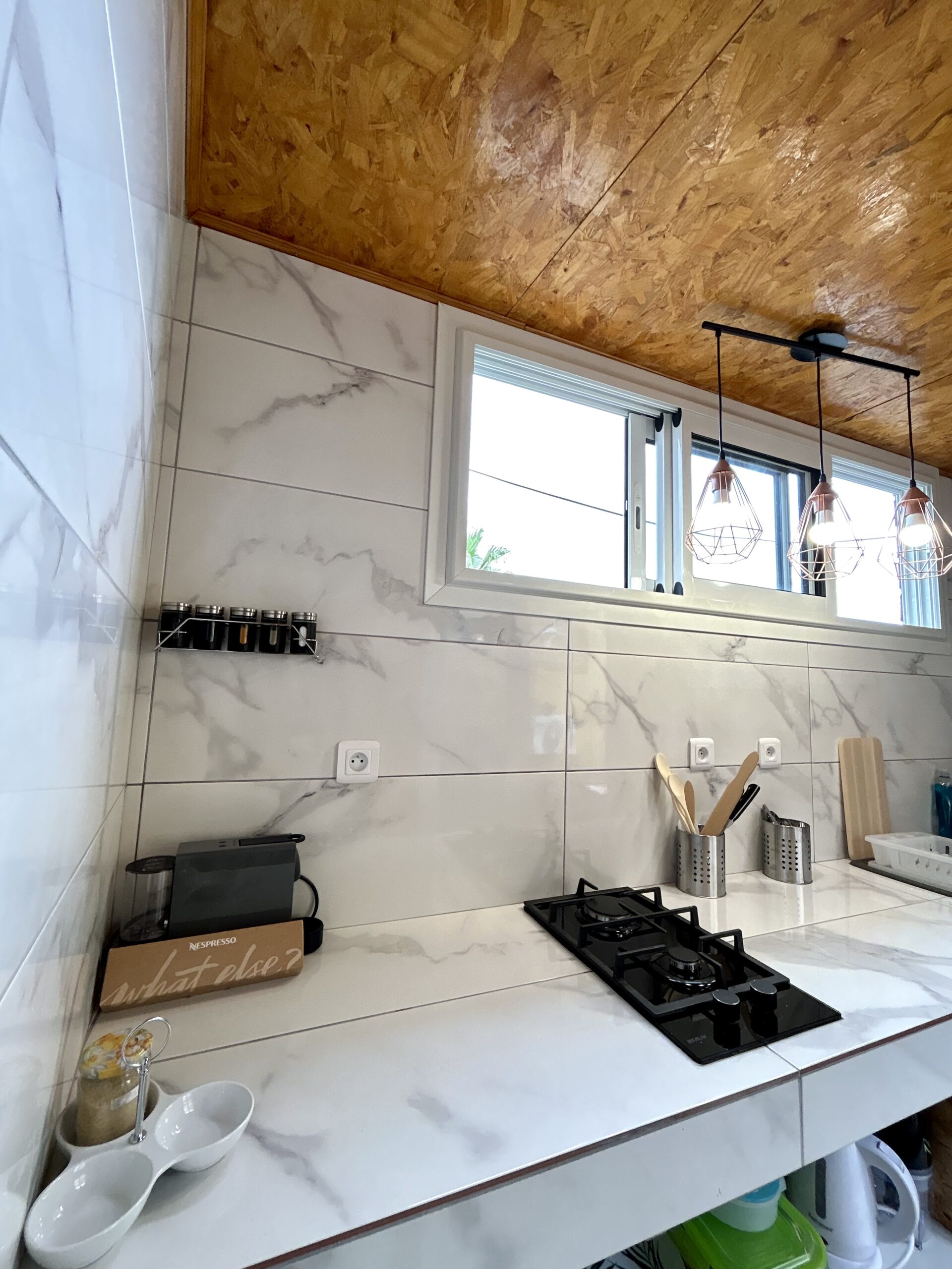 Issue d’un mélange entre marbre et bois, notre cuisine est entièrement équipée, conçue pour ravir les amateurs de gastronomie.